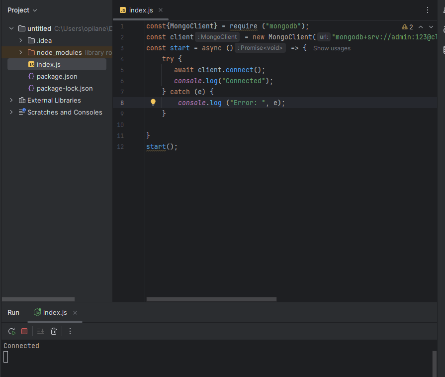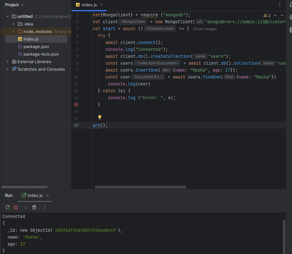 const client = new MongoClient("mongodb+srv://admin:123@cluster0.zdi1yox.mongodb.net/Masha?retryWrites=true&w=majority&appName=Cluster0");