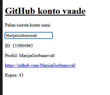 See kood näitab GitHubi kasutajanime ja lehekülje tema andmetega: kasutajanimi, ID, link profiilile ja repositooriumide arv. Kui sellist kasutajat pole või on tekkinud viga, kuvatakse vastav teade.